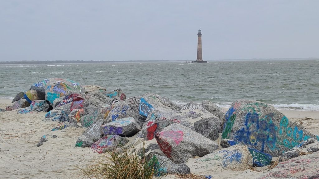 From there, we drove up Ashley Road to the county park overlooking the Morris Island Lighthouse. A leisurely half mile walk along a closed and graffiti decorated road led us to the remote beach. Once there, seeing the lighthouse standing alone in the water felt almost surreal. Built in 1876, automated in 1938, and decommissioned in 1962, the lighthouse now rises 161 feet above the waves—the tallest in South Carolina. Time and erosion have pushed the shoreline back, leaving the tower marooned offshore, a solitary sentinel still holding its place in history. We lingered there for a while, imagining the keepers who once climbed its spiral stairs.