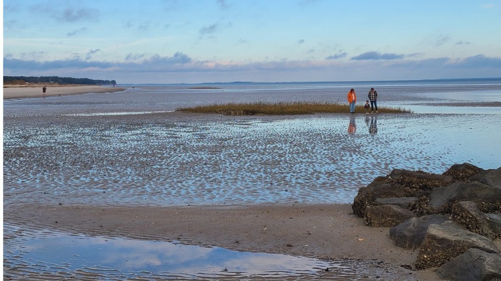 From there we headed about five miles north to Fish Haul Beach, near Port Royal Sound. Low tide had transformed the shoreline into a vast expanse of mudflats and rocky patches where mussels clung in clusters. With waders, you could walk far out across the flats, and we watched locals setting up chairs and little play areas for their kids, turning the exposed landscape into an impromptu playground. It felt like a different world from the Atlantic-facing beaches—quieter, more elemental.