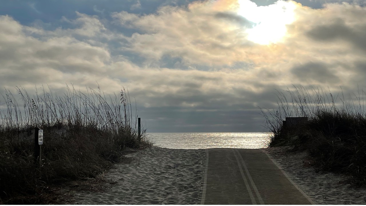 Out at the end, the ocean was alive. We watched porpoises glide just beyond the breakers, fish leaping in quick silver flashes, and fishermen lined along the railings with the easy patience of people who know the tides better than clocks. A few folks wandered the beach with metal detectors, sweeping the sand for lost treasures, while others stood at the railing with us capturing panoramic photos of the horizon. There was something peaceful about it — everyone doing their own thing, all drawn to the same stretch of ocean.
