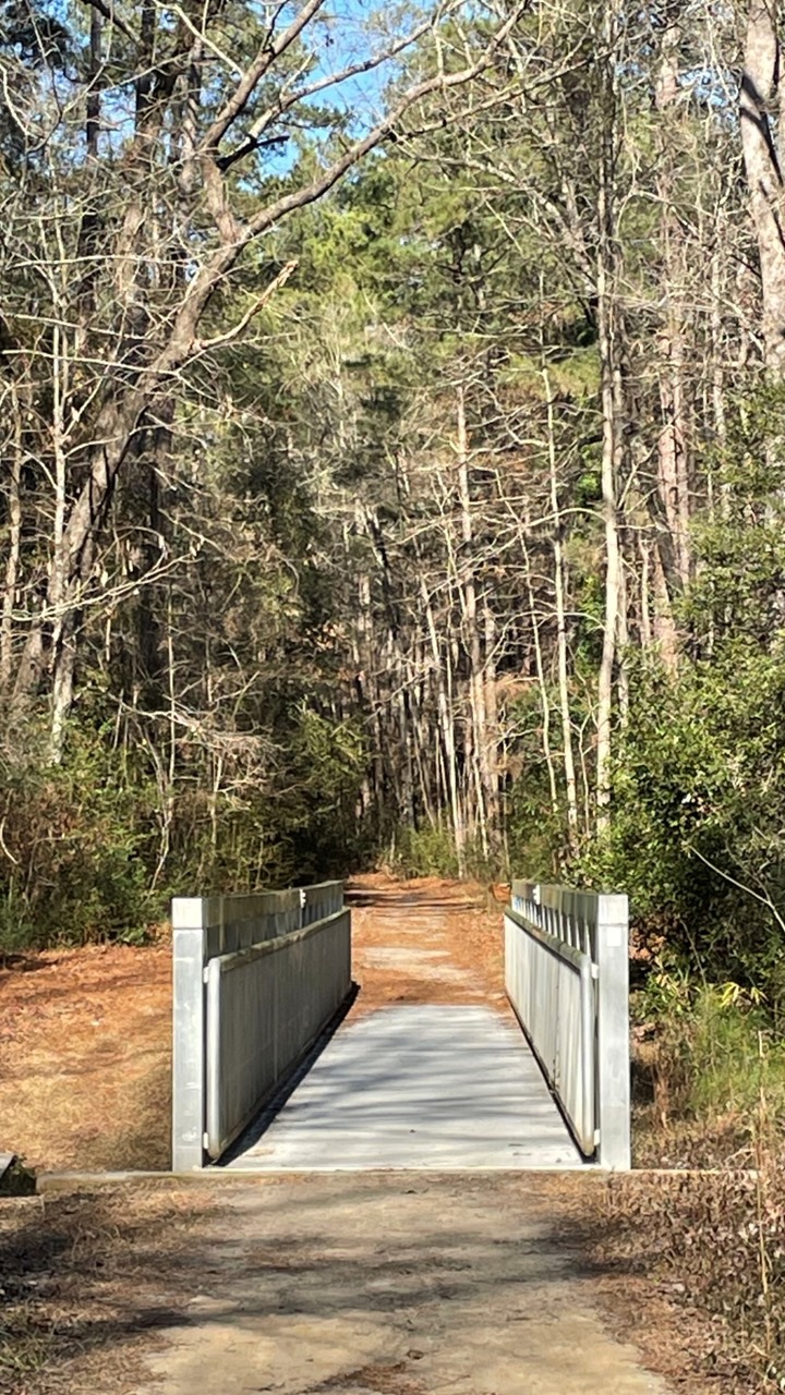 We set off on the Sandhills Hiking Trail, winding through longleaf pines and sandy soil that felt worlds away from the flooded forests of Congaree. The trail linked seamlessly into the Jackson Creek Nature Trail, where the sound of running water grew louder with each step. From there, we followed the Loop Trail deeper into the woods until the aluminum bridge appeared—bright, modern, and almost futuristic against the backdrop of old forest and CCC craftsmanship.