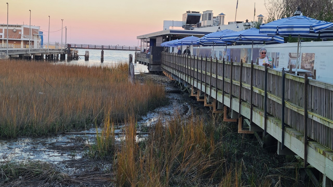 From the markets, we continued toward the waterfront until the grand white columns of the U.S. Customs House came into view, standing proudly above the harbor. Just beyond it was our destination for the evening: Fleet Landing, a waterfront bar and restaurant perched right over the water.